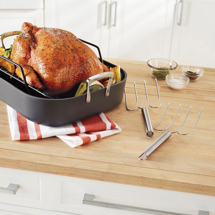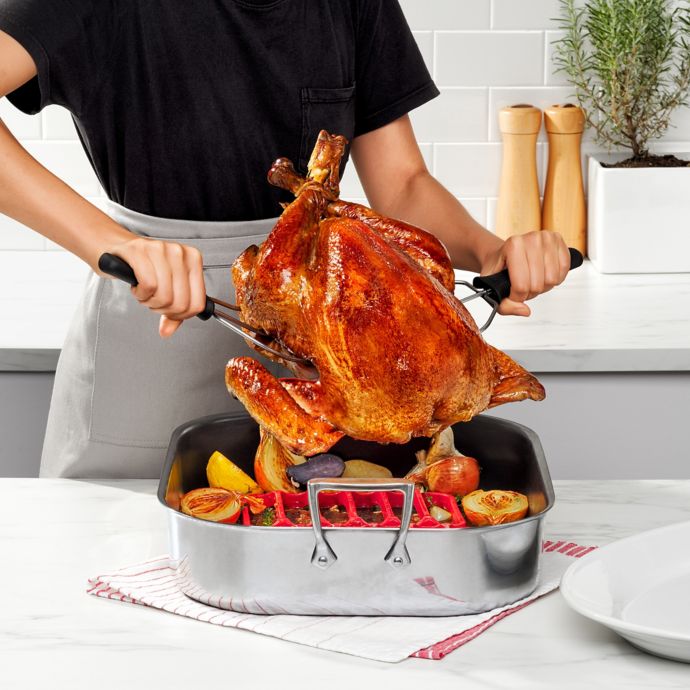 When it s time to remove the bird from the oven simply lift the rack out of the roasting pan then use the lifters to move the turkey to the serving platter.